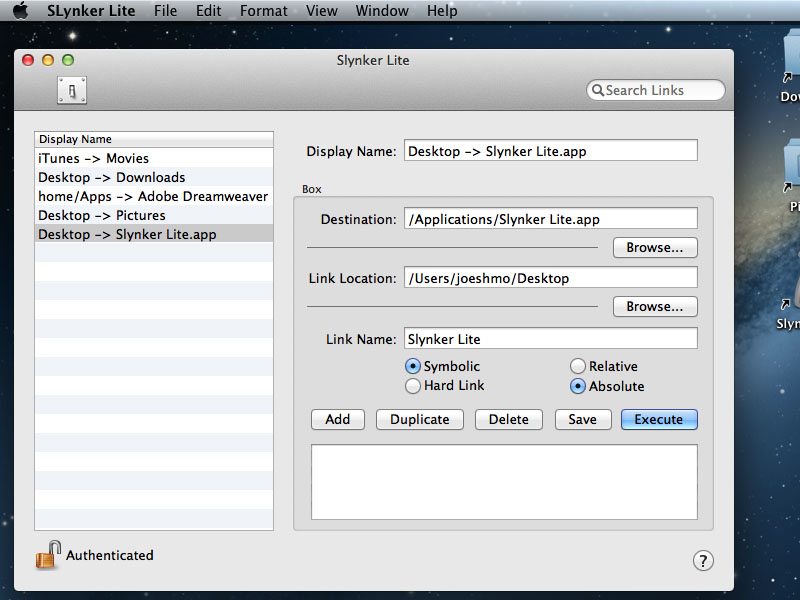 Provide destination URL and link location URL and SLynker does the rest. You can choose symbolic links or hard links, relative path linking or absolute file system linking. This is an ideal tool if you need access to a single file from multiple directories. If you place the link on a networked drive and use relative path linking, anyone who clicks the link will see the original. Unlike aliases, linker's files are tiny. Keep your original files organized and then make grouped sets of links and organize the same files in a different way. Once you try SLynker, you'll never use the 'Make Alias' command again.