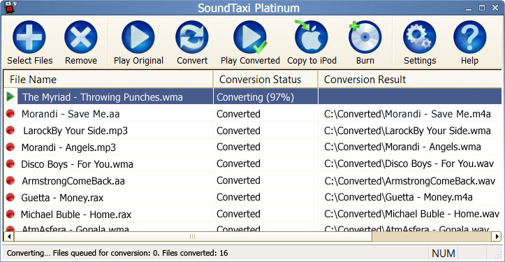 Easily convert DRM protected and non-protected music files to unprotected iPod, MP3 or WAV formats. High speed. SoundTaxi is very easy to install and use. With just a few mouse clicks you can enjoy all your protected music on iPod, any other MP3 player, CD player, mobile phone or PC - without any restrictions or DRM protection.