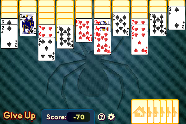 Mind your steps and plan your moves carefully in the two-suit Spider Solitaire! Your goal in this game is to arrange the cards by suit from K to A so that they can be removed. The game starts with 10 tableau piles, with each of the four piles on the left contains 4 downturned cards and each of the remaining piles contains 3 downturned cards. Each of the tableau piles will then be dealt 1 upturned card. The remaining cards are downturned and divided into 6 stock piles at the bottom right corner of the screen. You can move a group of cards built down by suit or a single card to another tableau pile if the move itself is in sequence, for example, a 3 of spades and a 2 of spades can be moved to a 4 of hearts. The downturned cards on the tableau piles will reveal when the upturned cards are removed. An empty tableau pile can be occupied by any card. If no more moves can be made, you can click a stock pile to deal new cards, but note that this can only be done when all tableau piles are occu