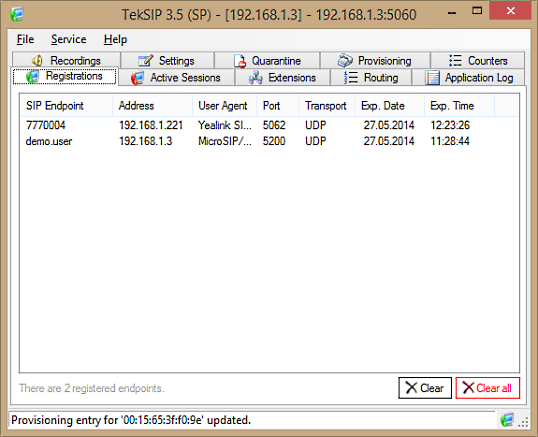 TekSIP is a SIP Registrar and Proxy. TekSIP tested on Microsoft Windows XP, Vista, Windows 7, and Windows 2003/2008 server. TekSIP complies with RFC 3261, RFC 3263, RFC 3311, RFC 3581 and RFC 3891. It supports NAT traversal, UPnP and ENUM. Please see technical details about NAT traversal in Readme.txt. You can select IP address to be listened, alternative SIP routes for outgouing calls. TekSIP has a Presence Server (SIP/SIMPLE based). You can also log session details and errors into a log file. TekSIP supports RADIUS Authentication (RFC 2865) and RADIUS Accounting (RFC 2866). TekSIP can optionally act as a B2BUA for incoming 3xx SIP responses. TekSIP can act as RTP Proxy and record auido treams if RTP proxy is enabled. TekSIP can register to upstream SIP servers to receive incoming calls. TekSIP monitors failed registration and call attempts from suspicious endpoints and blacklists them. You can monitor black listed endpoints through TekSIP Manager and you can remove black listed endpo