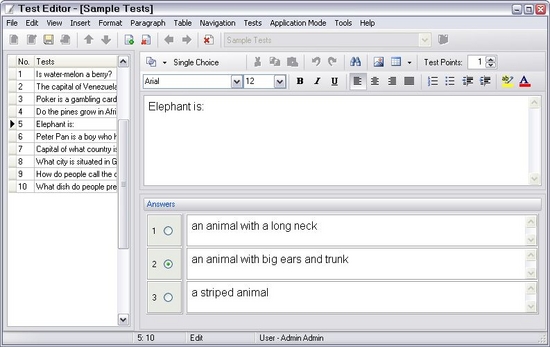 Test Maker will help you to create any type of questions: single choice, multiple choice, essay and ordered answer set. You can assign a point to each question depending on its complexity.