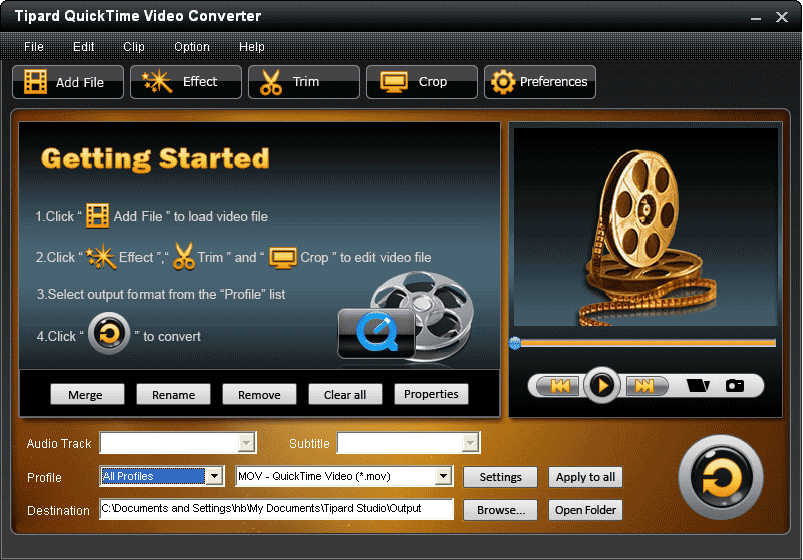 Tipard QuickTime Video Converter is the best way to convert video to QuickTime format, MOV, MP4. The adding video file formats is so powerful, like MPG, SWF, FLV, VOB, MOD, MP4, H.264, M4V, AVI, WMV, 3GP, 3GPP, MOV, DivX, XviD, DV, MJPG, MJPEG, MPV, and High Definition video files. What’s more, the Apple QuickTime Video Converter allows you to enjoy digital music in good sound, since it can convert audios and extract audio from video sources to AAC, AIFF, MP3, M4A, WAV.