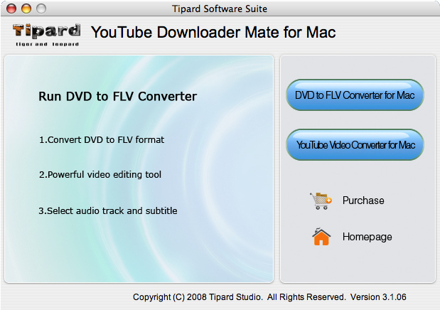 Tipard YouTube Downloader Mate for Mac is top Mac YouTube Downloader Mate for Mac users. It blends the functions of Mac DVD to FLV Converter and Mac Video to YouTube Converter So it is available to convert MPEG, WMV, AVI video to YouTube FLV on Mac, as well as VOB, MP4, M4V, RM, RMVB, WMV, ASF, MKV, TS, MPV, 3GP,3G2, MPV, MOD, TOD to FLV Mac for the YouTube uploading or other else. You can also make it easy to convert DVD to FLV videos on YouTube, Google Video, Myspace, Yahoo! Video, etc.