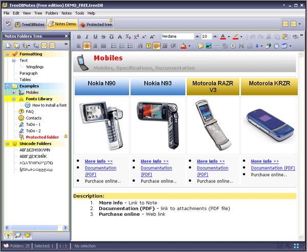 TreeDBNotes is a free powerful and easy-to-use personal database program, e-Book, PIM and Word Processor with Tree Structure, advanced encryption and password protection. Features: Search, Replace, Case options, Insert file, link, image, time, date, symbols, table, html table. Import from txt, wri, rtf, Excell, Word, html and more. Export to txt, html, wri, doc and more. This program is ideal for storing notes, emails, images, URLs, document management, etc. TreeDBNotes stores and represents your information in a comfortable and clear tree-structured form. Each node in such 'tree' represents associated note, so you can store a lot of mostly independent notes in one notebook. With any note you can perform main Wordpad-like text-formatting functions (font and paragraph styles).