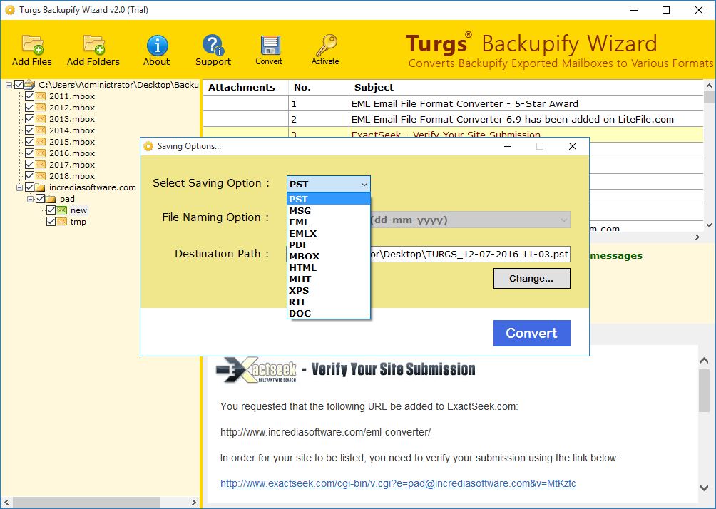 Backupify to Outlook converter provided by Turgs makes you able to access Backupify data in MS Outlook PST form or you can also convert your data in other file formats like MSG, EML, EMLX, PDF, MBOX, HTML, MHT, XPS, RTF, and DOC file formats. Backupify is an easy option to create backup of Cloud data in cloud for Gmail, Google Apps etc. But for ease of users, it also provides you an option to create archive of Backupify data into MBOX format that can be stored in local drive. You can access this data using MBOX supported email client but, if you want to access or convert Backupify data into Outlook PST then, you need to use some third party tools like Backupify to Outlook converter provided by Turgs. It also provides you an option to merge multiple MBOX files created by Backupify tool into single MBOX or PST file format. This tool is beneficial in many aspects like it preserves data integrity and emails metadata information like to, cc, bcc, sent/receive date & time. Etc, maintains fil