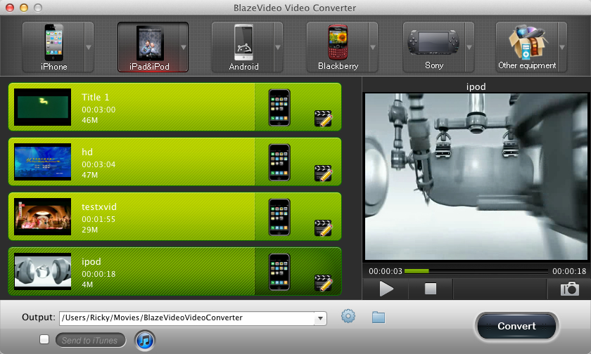 BlazeVideo Video Converter for Mac offers an ultimate video conversion solution in Mac OS. With BlazeVideo Video Converter for Mac, you can easily convert all common video formats into the proper formats that are playable on most popular portable devices like Apple iPad, iPhone, iPod, BlackBerry ,Sony family, Android cell phones.
