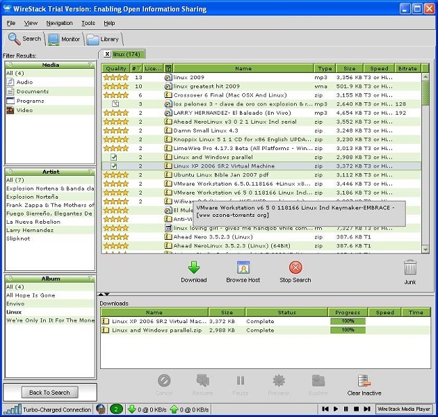 WireStack supports the Gnutella file-sharing protocol and that equals to millions of users and just as many chances to find what you're looking for.