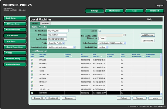 WOOWEB-PRO V5 can manage thousands of machines and users, 4 LANs, and 64 Internet connections. The global bandwidth can be distributed evenly to all users, or shared out according to configurable per-user rules, guaranteeing a minimum or a maximum percentage of the global throughput. The firewall provides strong protec