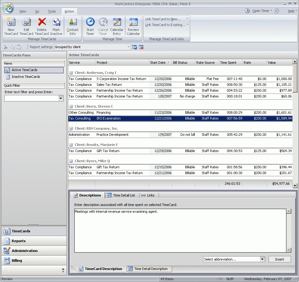 WorkCentrics for Microsoft Office is a powerful time tracking and activity management system that not only takes advantage of, but enhances, existing data and functionality on your desktop. WorkCentrics supercharges the Microsoft Outlook personal information manager to create an all-in-one solution to your time tracking needs. Integration with Outlook is delivered in real-time, and the program’s simple TimeCard interface lets you effortlessly manage the links between your time and the other elements of your work product, including your documents and Outlook tasks, appointments, notes and messages. Flexible installation and setup options provide customizable solutions for any professional service provider, from those with simple time tracking needs in government, education, and sales, to those with more complex billing or job costing needs, such as attorneys, accountants and architects. When optionally used with the Microsoft Exchange Server collaboration platform, these benefits ar