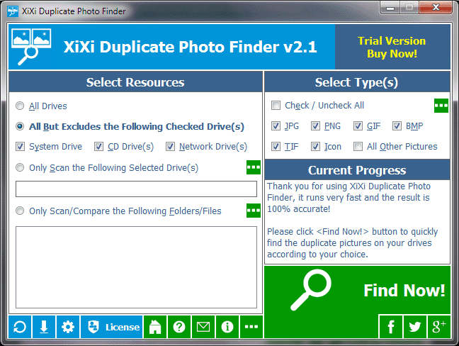 XiXi Duplicate Photo Finder - Fast finds the duplicate pictures on your drives relied on picture content, you can remove the unwanted pictures as you expect to recover your valuable disk space, reduce the management costs and avoid the unnecessary confusion. It works very fast because of our high-speed picture comparison algorithm is built-in. And the result (duplicate pictures) is 100% accurate due to it compares picture content, not picture name, last modified date or file size. Also, it is very easy to use, only need to select the resources, type(s), and then click the "Find Now!" button to get your want. Even, you can simply click this button directly by use the suggested search conditions. Once the finding is done, you will see the result (the duplicate pictures list and previews for the selected group) instantly. It sorts the result by size in descending, and marks the adjacent duplicate picture groups by different colors, in order to let you operating the duplicate pictures conv